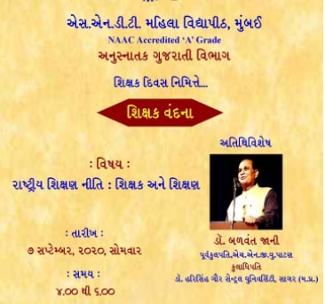 Special Assistance Programme (SAP- DRS –UGC) awarded to Department of Gujarati of SNDTW University, by the UGC to encourage the “Pursuit of excellence and team work in research and teaching to accelerate the realization of international standards in specific fields”.