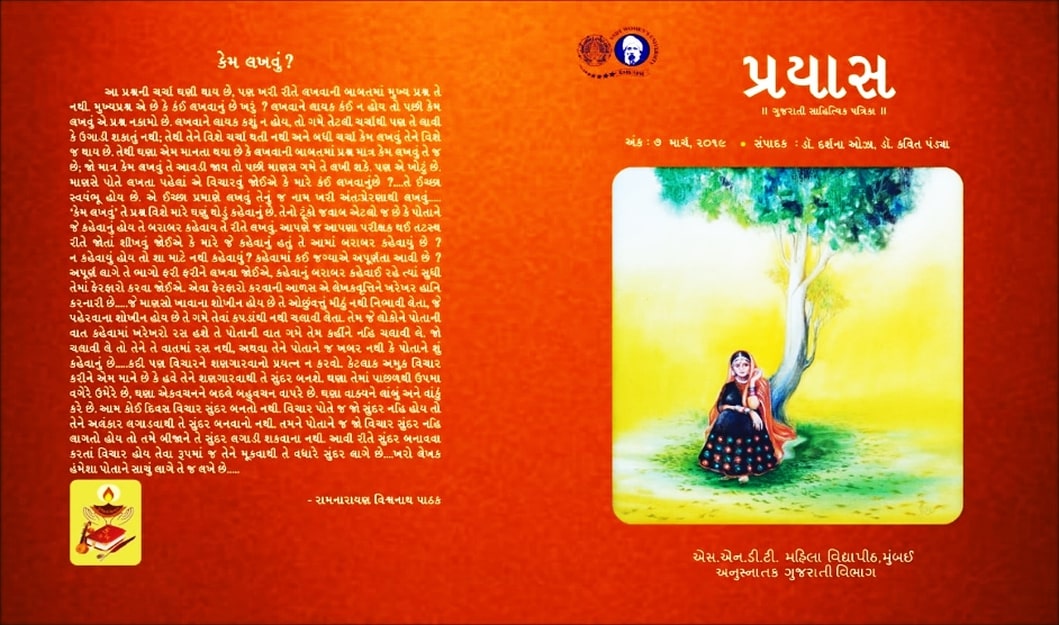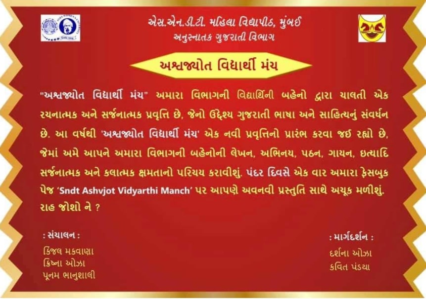 Department of Gujarati Overview Welcome to the Department Of Gujarati at S.N.D.T.Women”s University , Mumbai-20. Established in 1951, The Department of Gujarati separated from U.G. in 1984 .Former Departmental Heads namely Shree Himmatlal Anjaria, Shree Ramnarayan Pathak, Shree Sundarji Betai, Prof. Suresh Dalal, Prof. Nalinee Madgaonkar, and Dr. Nutan Jani nurtured the department with their excellence. Our department is dedicated to advancing knowledge and understanding in the field of Humanities , Social Science , Gujarati Literature Our faculty and staff are committed to providing a supportive and inclusive learning environment for our students.