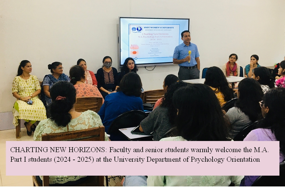 The Department of Psychology at SNDT Women’s University, Churchgate, recently held an inspiring orientation program for the incoming M.A. Part I students, marking the beginning of their academic journey for the 2024-2025 session. The event took place on July 30, 2024, in classroom 601, where 83 newly admitted students were warmly welcomed by the department’s faculty and staff.