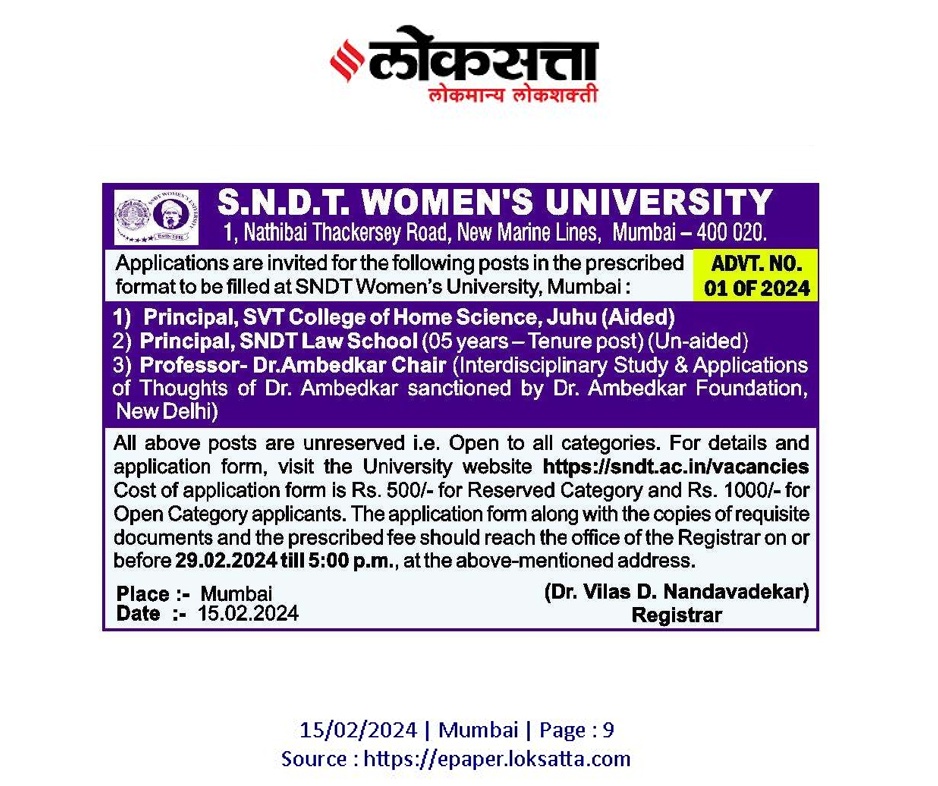 Advertisement No. 01 Of 2024 for the Various Post at SNDTWU