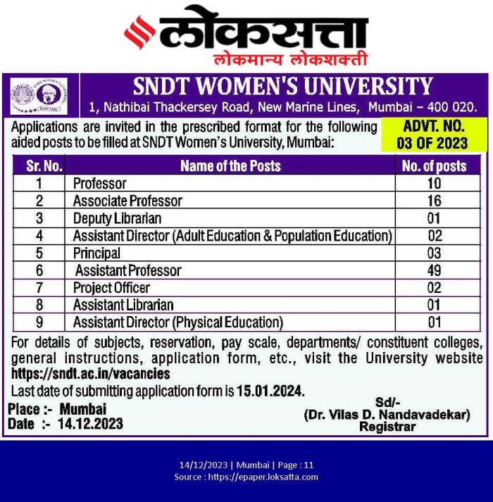 Advertisement No. 03 Of 2023 for the Various Teaching Post at SNDTWU